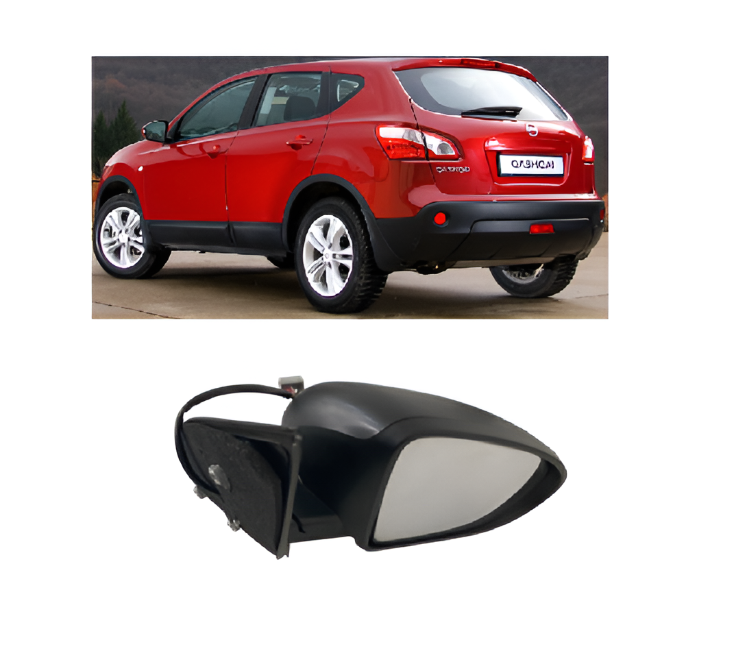 Espejo lateral derecho (lado pasajero) compatible con Nissan Qashqai desde el año 2010 hasta 2014, correspondiente a la primera generación (J10). Este repuesto es ideal para reemplazar espejos dañados por golpes, desgaste o roturas, manteniendo la estética y funcionalidad original del vehículo.