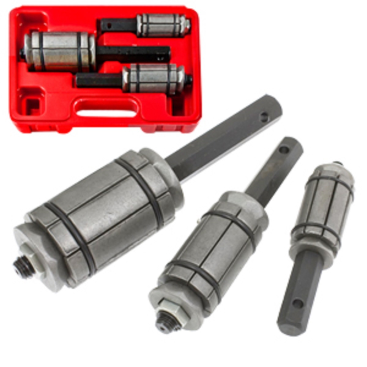 El juego de 3 expansores de tubos de escape es una herramienta esencial para trabajos de escape automotriz. Permite expandir, ajustar y alinear cañerías de escape sin dañar el material, facilitando la instalación o reparación de tubos, silenciadores y uniones.