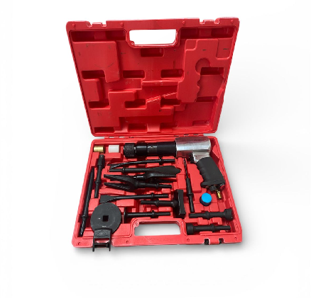 El martillo neumático automotriz con set de 16 piezas de herramientas es un equipo profesional diseñado para realizar trabajos de corte, cincelado, desbaste y remoción de piezas en talleres mecánicos, automotrices e industriales. Su funcionamiento mediante aire comprimido entrega una alta potencia de impacto, permitiendo ejecutar tareas exigentes con mayor rapidez, precisión y menor esfuerzo físico.