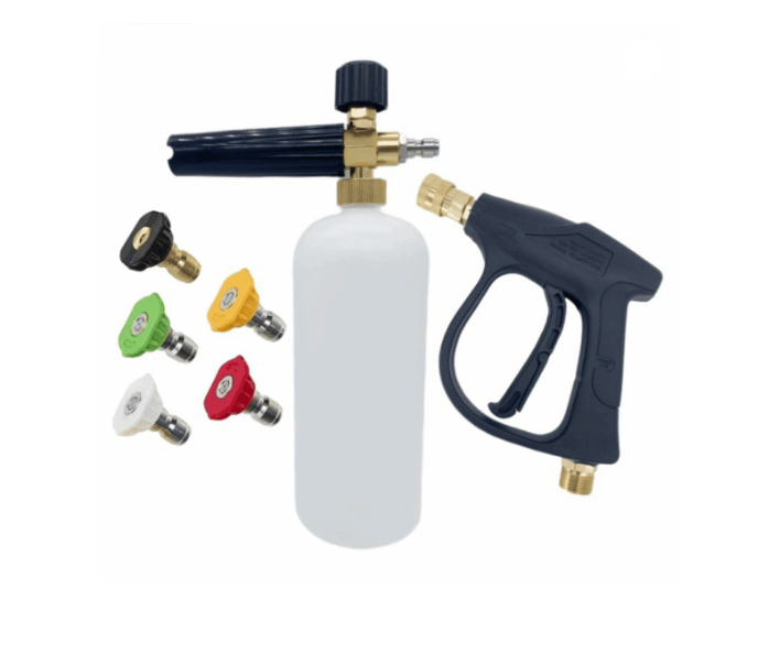 La pistola de espuma para hidrolavadora es el accesorio ideal para lograr un lavado automotriz profundo, seguro y profesional, tanto en talleres de detailing como en uso doméstico. Diseñada para conectarse directamente a hidrolavadoras de alta presión, permite generar una espuma densa y uniforme que se adhiere a la superficie del vehículo, ayudando a remover suciedad, barro, grasa e insectos sin dañar la pintura.
